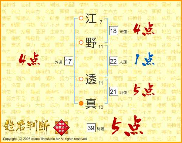 江野透真さんの総運は39画の5点!
