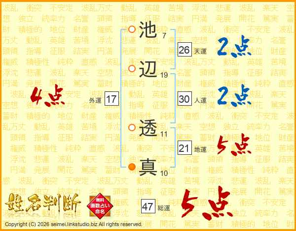 あなたの人生を表す1番重要な運勢です。生涯を通じて影響する総合運となり、主に50歳以降の晩年期に影響を及ぼします。苗字と名前の合計画数。