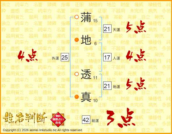 生活面を象徴する運勢です。外部から受ける影響力を表し、結婚運、家庭運や職場、環境への順応性を表します。総運から人運を引いた画数。姓や名が1文字の場合を除く。
