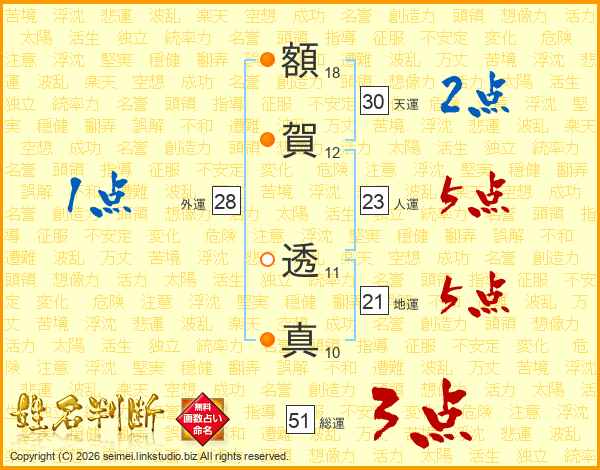 額賀透真さんの天運は30画の2点!