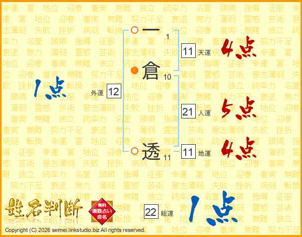 生活面を象徴する運勢です。外部から受ける影響力を表し、結婚運、家庭運や職場、環境への順応性を表します。総運から人運を引いた画数。姓や名が1文字の場合を除く。