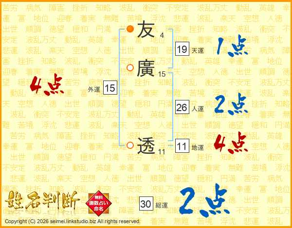 友廣透さんの総運は30画の2点!