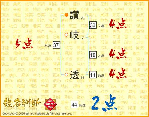 あなたの人生を表す1番重要な運勢です。生涯を通じて影響する総合運となり、主に50歳以降の晩年期に影響を及ぼします。苗字と名前の合計画数。