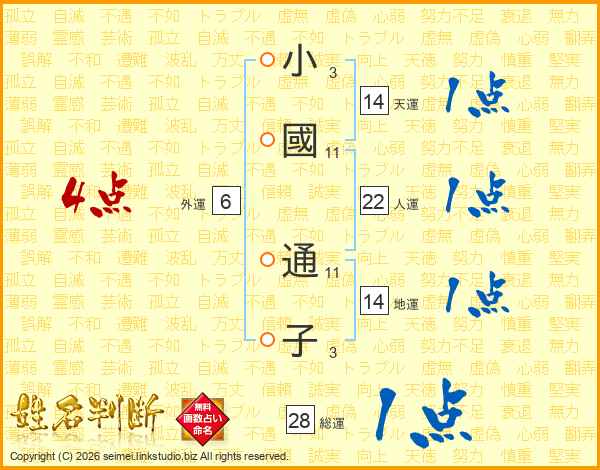 生活面を象徴する運勢です。外部から受ける影響力を表し、結婚運、家庭運や職場、環境への順応性を表します。総運から人運を引いた画数。姓や名が1文字の場合を除く。