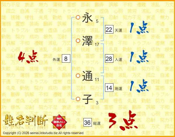 生活面を象徴する運勢です。外部から受ける影響力を表し、結婚運、家庭運や職場、環境への順応性を表します。総運から人運を引いた画数。姓や名が1文字の場合を除く。