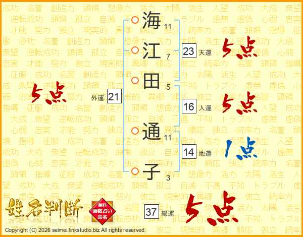 海(11画)江(7画)田(5画) 通(11画)子(3画)