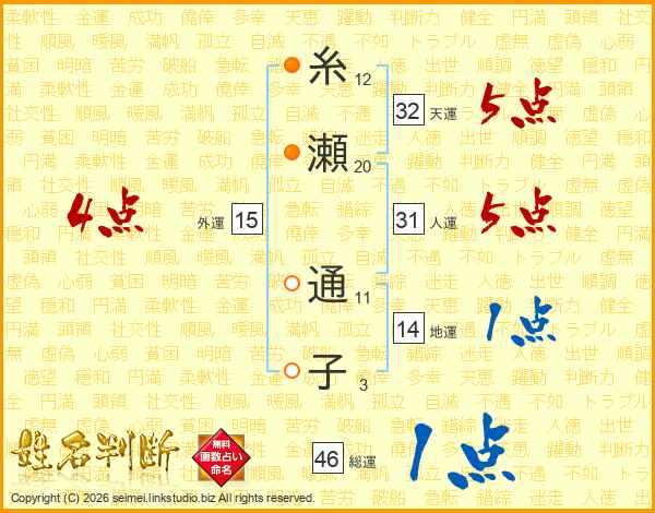 糸(12画)瀬(20画) 通(11画)子(3画)