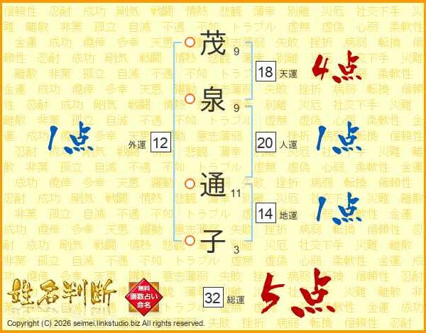 茂泉通子さんの総運は32画の5点!