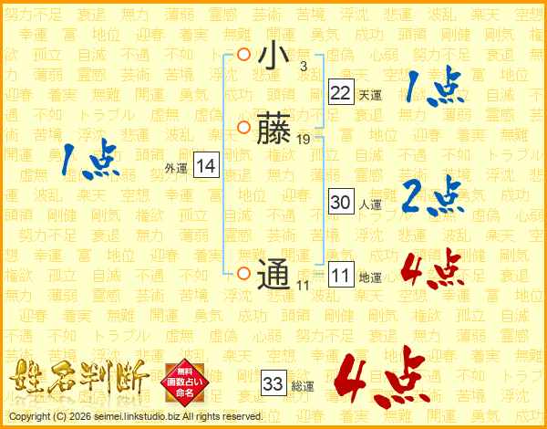 生活面を象徴する運勢です。外部から受ける影響力を表し、結婚運、家庭運や職場、環境への順応性を表します。総運から人運を引いた画数。姓や名が1文字の場合を除く。