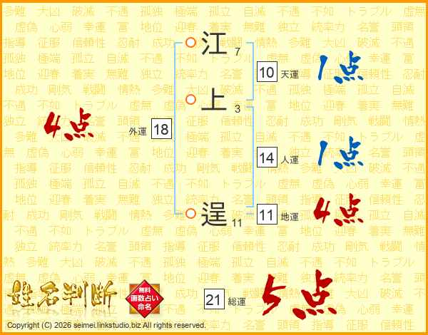 生活面を象徴する運勢です。外部から受ける影響力を表し、結婚運、家庭運や職場、環境への順応性を表します。総運から人運を引いた画数。姓や名が1文字の場合を除く。