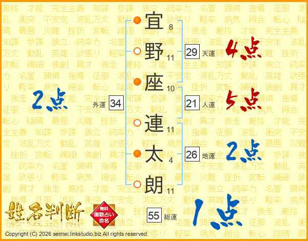 宜(8画)野(11画)座(10画) 連(11画)太(4画)朗(11画)