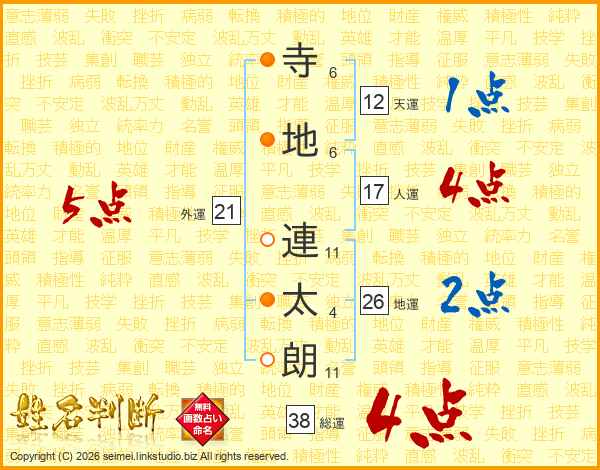 寺(6画)地(6画) 連(11画)太(4画)朗(11画)