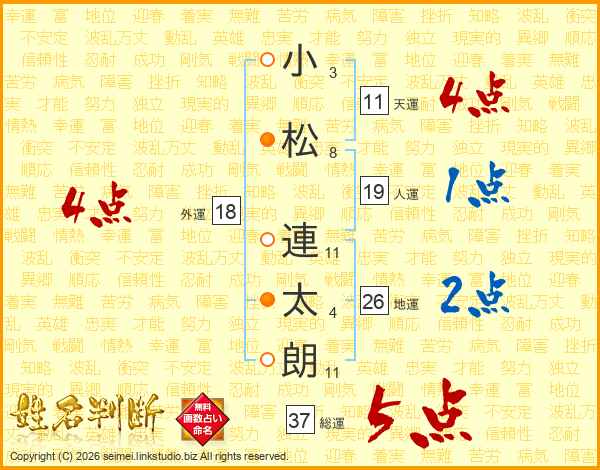 小(3画)松(8画) 連(11画)太(4画)朗(11画)