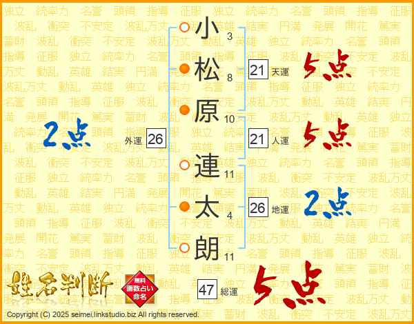 小(3画)松(8画)原(10画) 連(11画)太(4画)朗(11画)