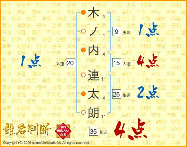 木(4画)ノ(1画)内(4画) 連(11画)太(4画)朗(11画)