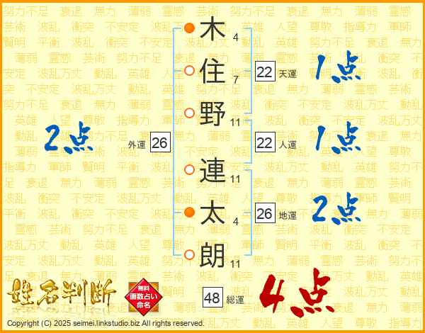 木(4画)住(7画)野(11画) 連(11画)太(4画)朗(11画)