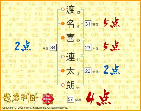 渡(13画)名(6画)喜(12画) 連(11画)太(4画)朗(11画)