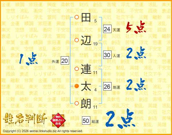 田(5画)辺(19画) 連(11画)太(4画)朗(11画)