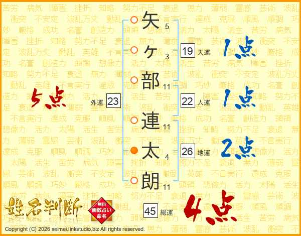 矢ヶ部連太朗さんの総運は45画の4点!