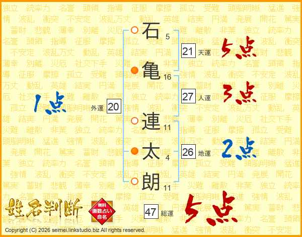 石(5画)亀(16画) 連(11画)太(4画)朗(11画)