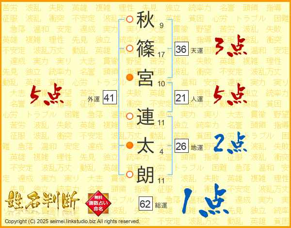 秋(9画)篠(17画)宮(10画) 連(11画)太(4画)朗(11画)