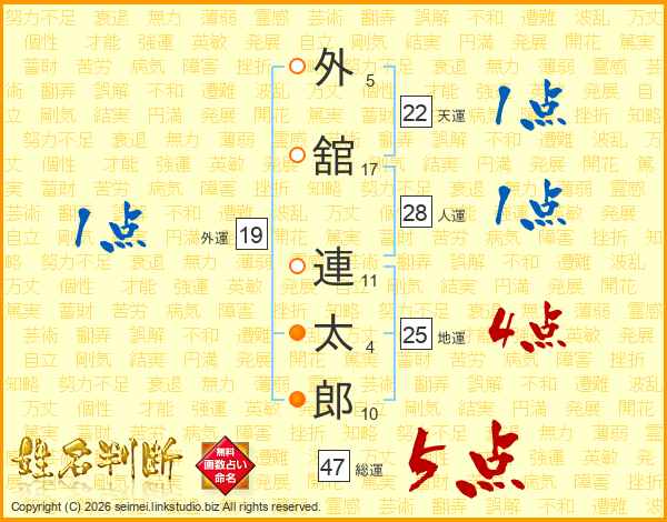 外(5画)舘(17画) 連(11画)太(4画)郎(10画)