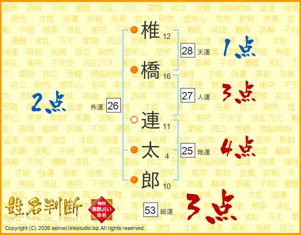 椎(12画)橋(16画) 連(11画)太(4画)郎(10画)