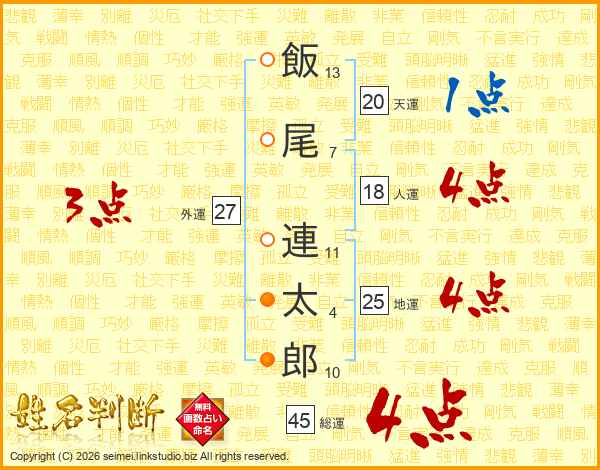 飯(13画)尾(7画) 連(11画)太(4画)郎(10画)
