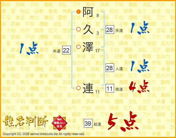 阿久澤連さんの総運は39画の5点!