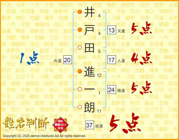 井(4画)戸(4画)田(5画) 進(12画)一(1画)朗(11画)