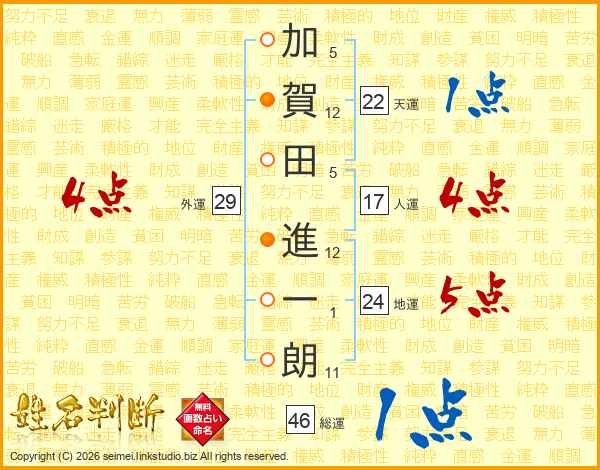 加(5画)賀(12画)田(5画) 進(12画)一(1画)朗(11画)