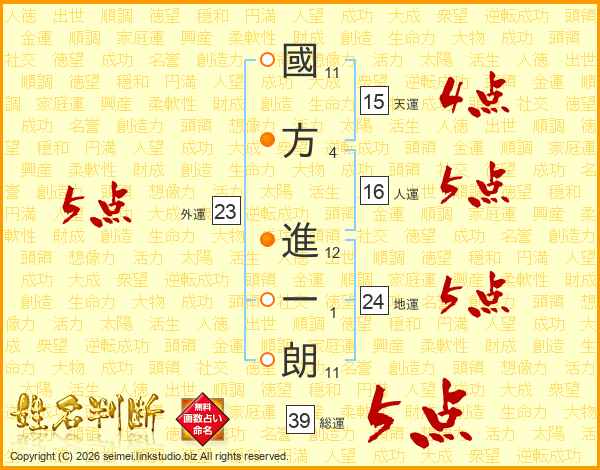 國(11画)方(4画) 進(12画)一(1画)朗(11画)
