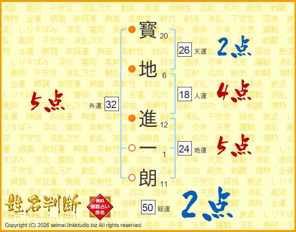 寳(20画)地(6画) 進(12画)一(1画)朗(11画)