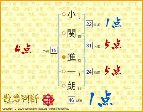 小(3画)関(19画) 進(12画)一(1画)朗(11画)