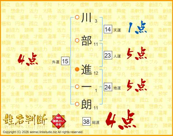 川(3画)部(11画) 進(12画)一(1画)朗(11画)