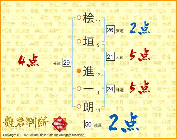 桧(17画)垣(9画) 進(12画)一(1画)朗(11画)
