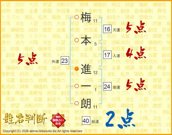 梅(11画)本(5画) 進(12画)一(1画)朗(11画)