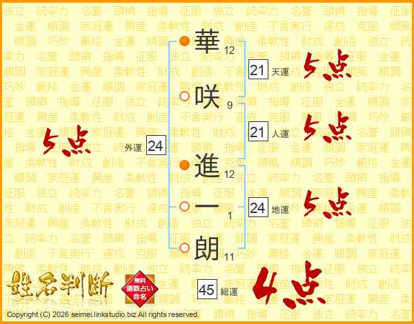 華(12画)咲(9画) 進(12画)一(1画)朗(11画)