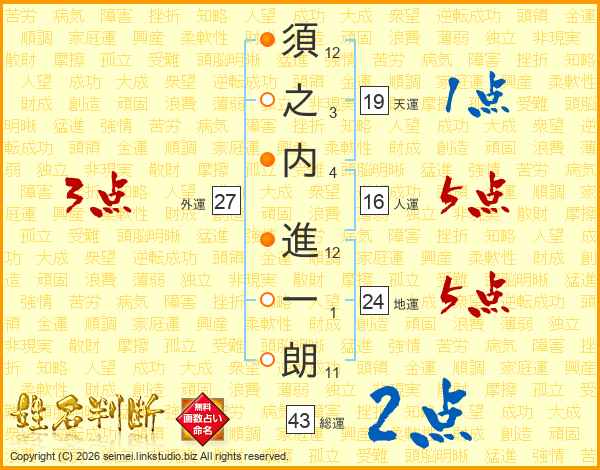 須(12画)之(3画)内(4画) 進(12画)一(1画)朗(11画)