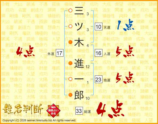 三(3画)ツ(3画)木(4画) 進(12画)一(1画)郎(10画)