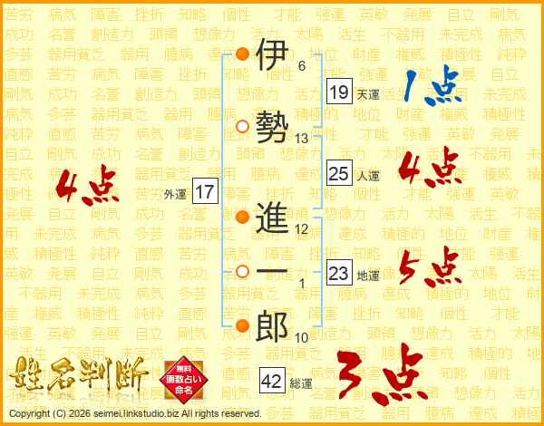 伊(6画)勢(13画) 進(12画)一(1画)郎(10画)
