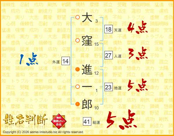 大(3画)窪(15画) 進(12画)一(1画)郎(10画)