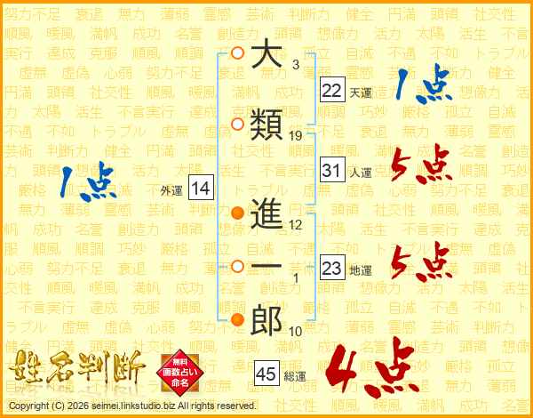 大(3画)類(19画) 進(12画)一(1画)郎(10画)