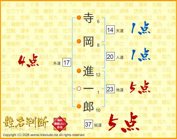 寺(6画)岡(8画) 進(12画)一(1画)郎(10画)