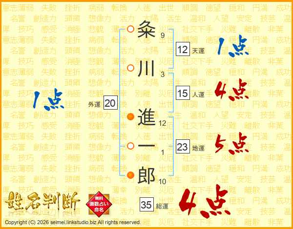 生活面を象徴する運勢です。外部から受ける影響力を表し、結婚運、家庭運や職場、環境への順応性を表します。総運から人運を引いた画数。姓や名が1文字の場合を除く。