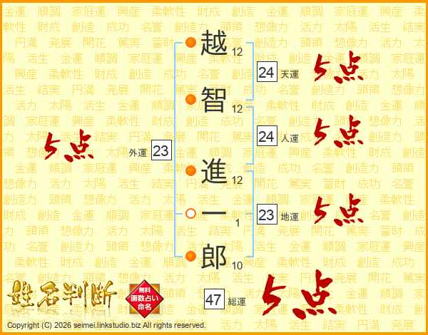 越(12画)智(12画) 進(12画)一(1画)郎(10画)
