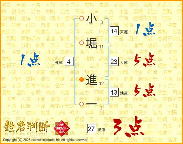 生活面を象徴する運勢です。外部から受ける影響力を表し、結婚運、家庭運や職場、環境への順応性を表します。総運から人運を引いた画数。姓や名が1文字の場合を除く。