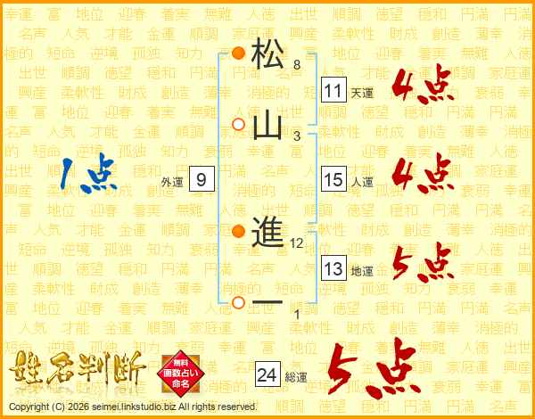 あなたの人生を表す1番重要な運勢です。生涯を通じて影響する総合運となり、主に50歳以降の晩年期に影響を及ぼします。苗字と名前の合計画数。