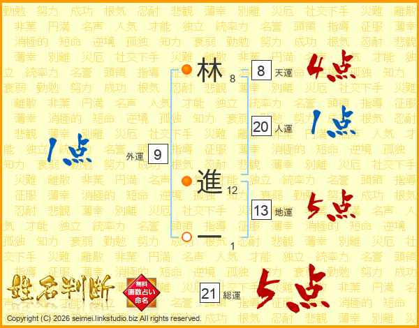 生活面を象徴する運勢です。外部から受ける影響力を表し、結婚運、家庭運や職場、環境への順応性を表します。総運から人運を引いた画数。姓や名が1文字の場合を除く。