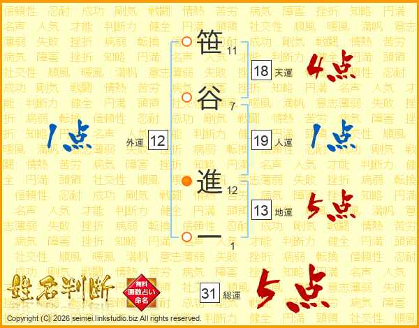 笹谷進一さんの総運は31画の5点!